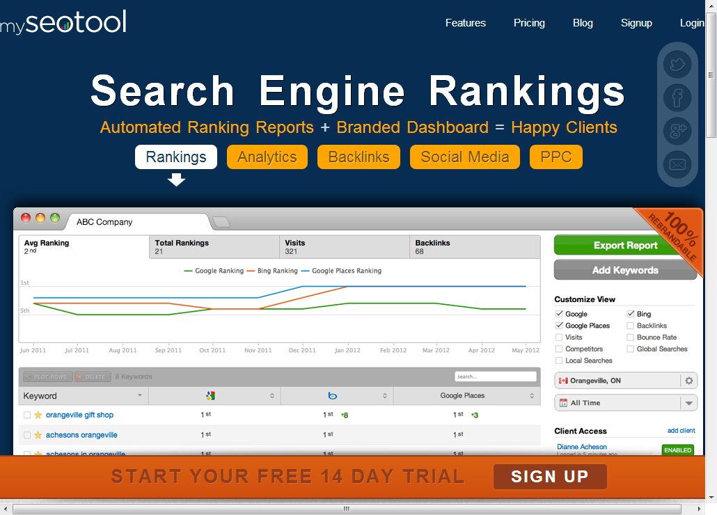5,www.myseotool.com。它分為很明確的五大模塊:排名,統計,導入鏈接,社會化媒體,PPC,從這些角度來進行SEO的整合分析。